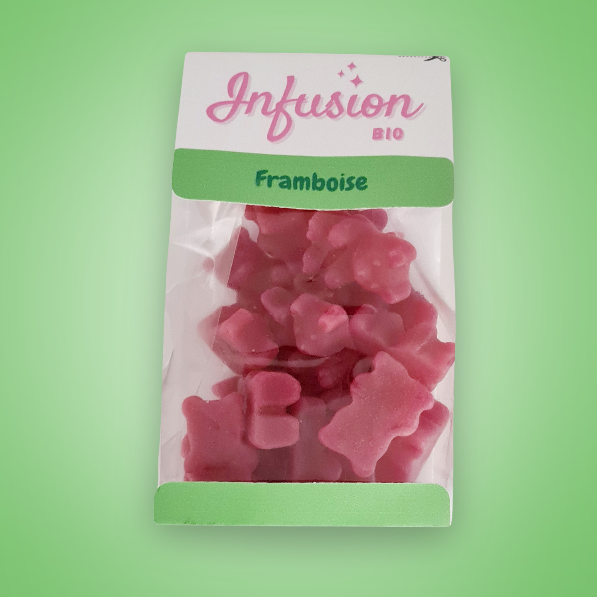 sucre*, sirop de glucose*, gelatine*, eau, acidifiant: acide citrique, arôme naturel de framboise, extrait de thé vert*, colorant alimentaire concentré (carotte*, pomme*, cassis*), agent d'enrobage: cire de carnauba*, huile de tournesol*, *produit issu de l'agriculture biologique.