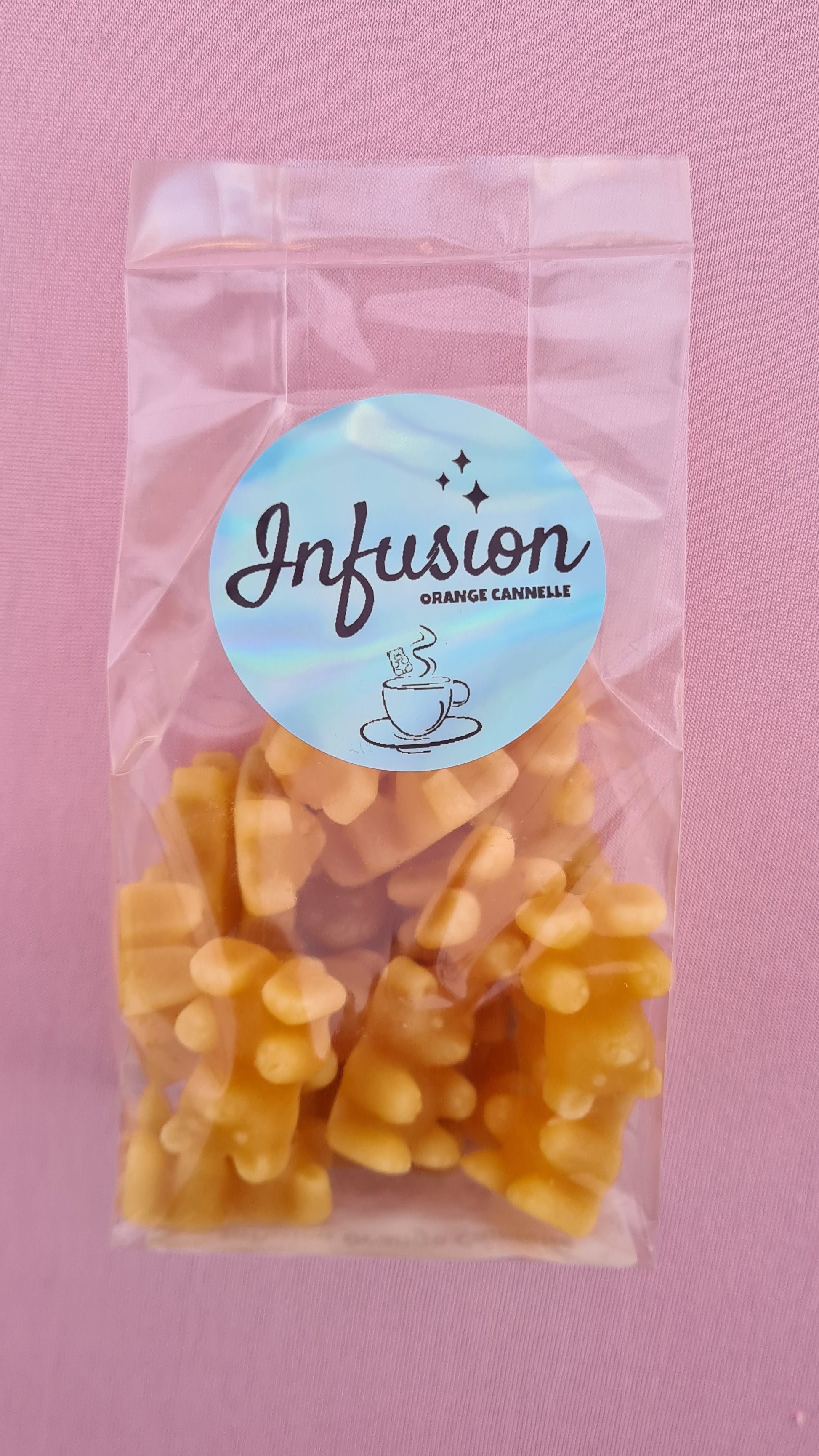 sucre, sirop de glucose, gelatine, eau, jus concentré du raisin blanc, acidifiant : acide citrique, arÎmes naturels, extrait de thé blanc, colorants alimentaires concentrés (carthame, radis rouge), édulcorant à base de jus de pomme concentré, jus de pomme concentré, jus concentré de poire, jus concentré d'abricot, agent d'enrobage : cire de carnauba.