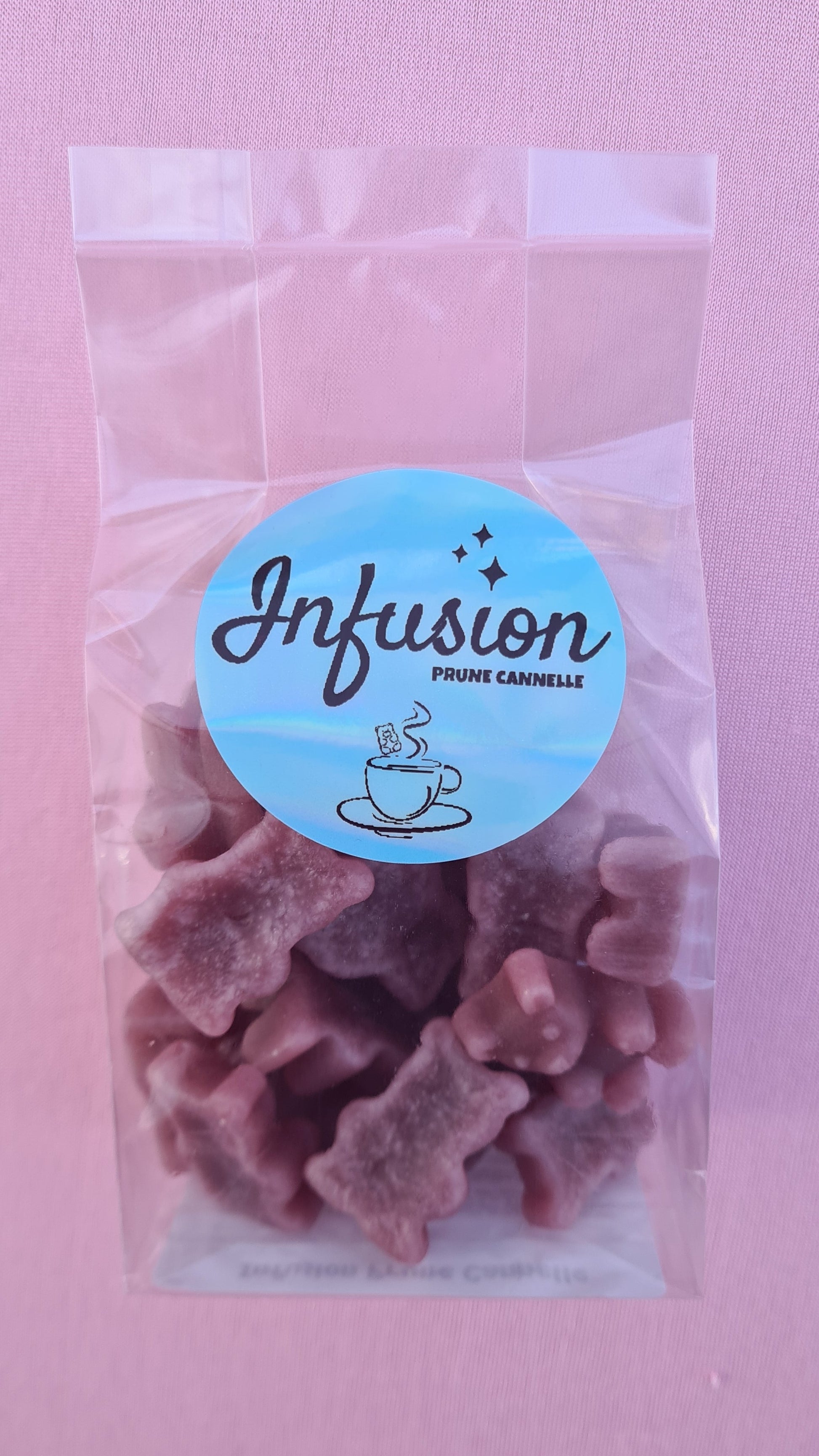 sucre, sirop de glucose, gelatine, eau, jus concentré du raisin blanc, acidifiant : acide citrique, arôme naturel, colorant alimentaire concentré (carotte noire, patate douce, pomme, radis, cerise), colorant alimentaire concentré (extrait de spiruline), extrait de thé blanc, arôme, édulcorant à base de jus de pomme concentré, jus de pomme concentré, jus concentré de poire, jus concentré d'abricot, agent d'enrobage : cire de carnauba.