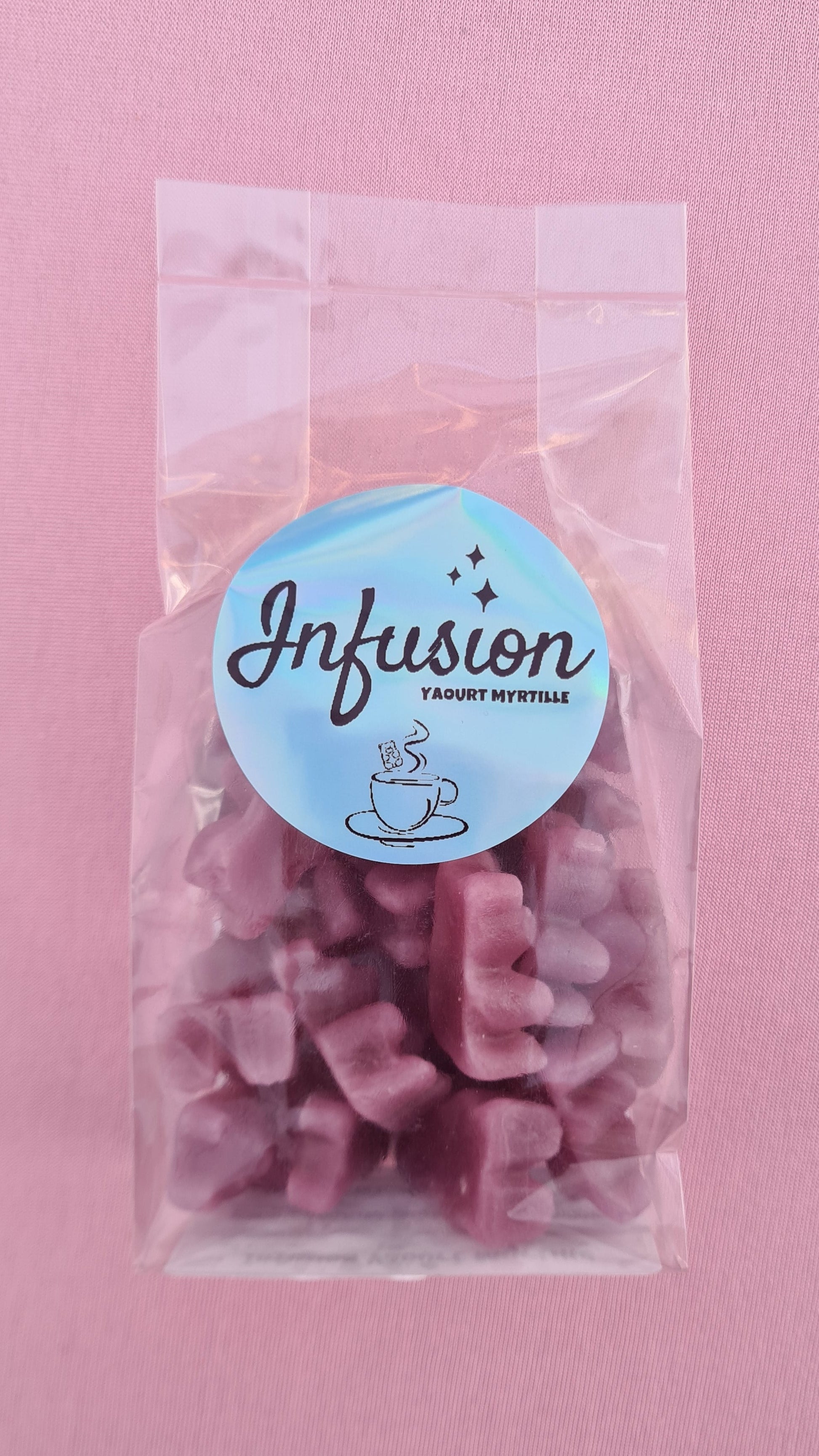 sucre, sirop de glucose, gelatine, eau, acidifiant : acide citrique, aromes, extrait de thé blanc, extrait de plantes colorant (radis, patate douce, cérise, pomme), agent d'enrobage : cire de carnauba, colorant: E133